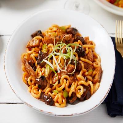 Gramigna pasta with pulled duck, spring onions and mushrooms in a sweet plum sauce